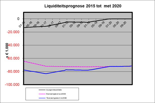De liquiditeitsprognose 2015-2020 laat een oplopend tekort zien. Deze financieringsbehoefte wordt voor een deel gedekt door langlopende geldleningen. Daar waar het de financiering van de BGE betreft wordt kort geleend. Voor alsnog wordt niet verwacht dat de kasgeldlimiet wordt overschreden. Waar dit mogelijk het geval dreigt te worden zal een lening aangetrokken worden langer dan een jaar, zoveel mogelijk aansluitend aan de geprognosticeerde opbrengsten uit bouwgrond.