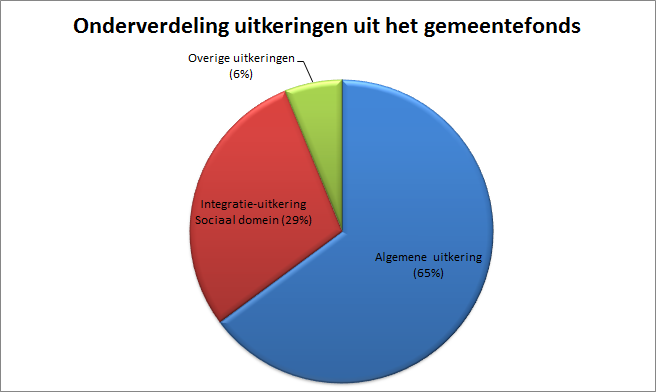 De algemene uitkering is met 65% de grootste component in de uitkeringen uit het gemeentefonds. De integratie-uitkering sociaal domein is veruit de grootste van de integratie-en decentralisatie-uitkeringen.